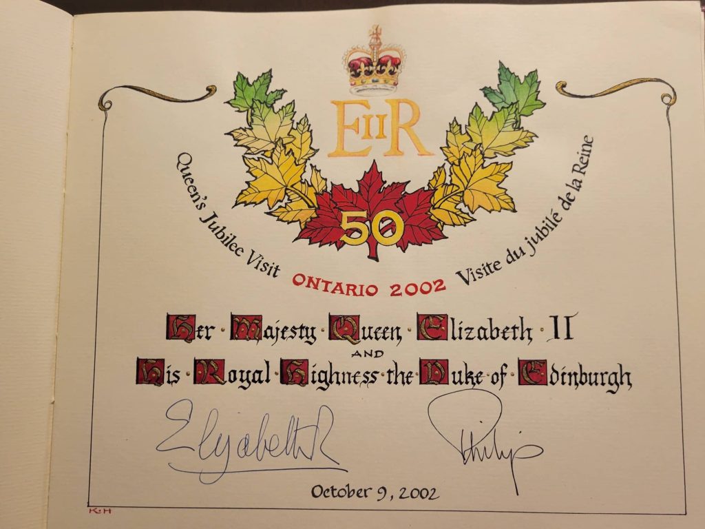 Calligraphy is simply a beautiful art form. Although I no longer consider myself a professional Calligrapher, as I was when I did the Province of Ontario’s Official Book of Visiting Dignitaries over several years, or the nomination certificates aeons ago for the old Juno and Genie Awards here in Canada, I can’t quite stop writing with an old-fashioned pen. If you have a special card, invitation, menu or presentation piece that would be elevated by Calligraphy, I am open for commissions. You could mention to your friends that the Queen twice signed pages created by your Calligrapher.