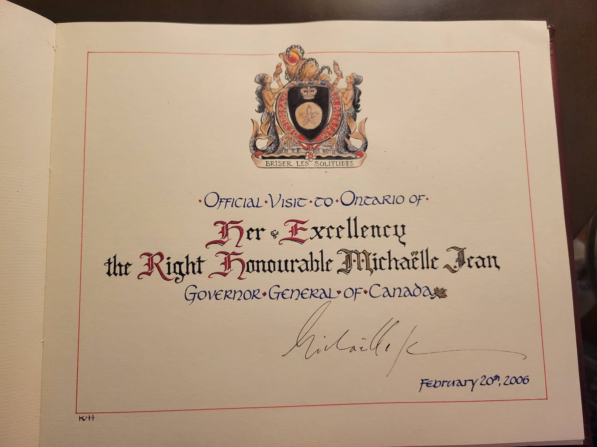 Calligraphy is simply a beautiful art form. Although I no longer consider myself a professional Calligrapher, as I was when I did the Province of Ontario’s Official Book of Visiting Dignitaries over several years, or the nomination certificates aeons ago for the old Juno and Genie Awards here in Canada, I can’t quite stop writing with an old-fashioned pen. If you have a special card, invitation, menu or presentation piece that would be elevated by Calligraphy, I am open for commissions. You could mention to your friends that the Queen twice signed pages created by your Calligrapher.
